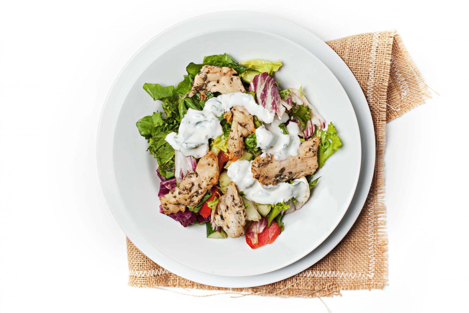 Zeleninový salát s grilovaným masem a jogurtovým dresinkem = 850 kJ