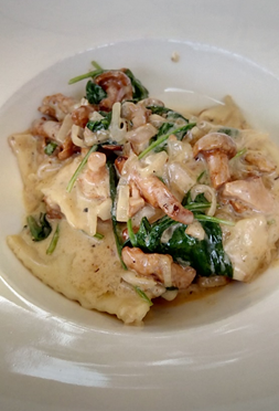 Za hlavní jídlo jsme si vybrali těstoviny s liškami, smetanou a baby špenátem. Byla jsem moc zvědavá na kombinaci s liškami, ty u nás moc nerostou, nebo lépe řečeno, našla jsem letos jen dvě miniaturní. Bylo to moc dobré. Další zvolili jehněčí terinu s petrželovým pyré a ředkvičkami, anebo pomalu pečenou kančí kýtu, o které jsem již psala.