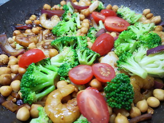Po přibližně pěti minutách přidejte polévkovou lžíci sladké mango chilli omáčky a chvíli poduste. Pak přidejte brokolici, kterou jste předem spařili a rozdělili na malé růžičky. Spolu s brokolicí přidejte i propláchnutou cizrnu a opět poduste.