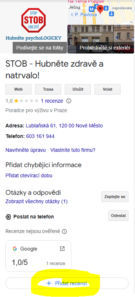 Je to jednoduché – stačí vyhledat STOB ve vyhledávači Google. Napravo v panelu, kde jsou informace o společnosti STOB, jako je např. adresa a telefonní číslo, se pod sekcí Otázky a odpovědi nachází Recenze. Přes tlačítko "+ Přidat recenzi" je možné vložit váš komentář. Budeme za něj moc vděční.