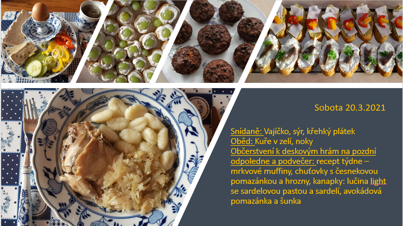Dala jsem si závazek, že do velikonoc budu na váze z 1. ledna. Vánoce na mně žádné následky nezanechaly, ale stávající situce se projevila negativně. Takže každé deko se počítá. Nerada bych se dočkala toho, aby až budu moci mezi lidi, nebudu mít co na sebe. Teď je to ten stav, mám co na sebe, ale nemám to kam nosit. A když jídlo fotím, jsem nejen pod svou kontrolou. A třeba se najde někdo, koho budu inspirovat. Sebekoučink mám zatím do 29.března a píši přesně, i orientačně vážím.