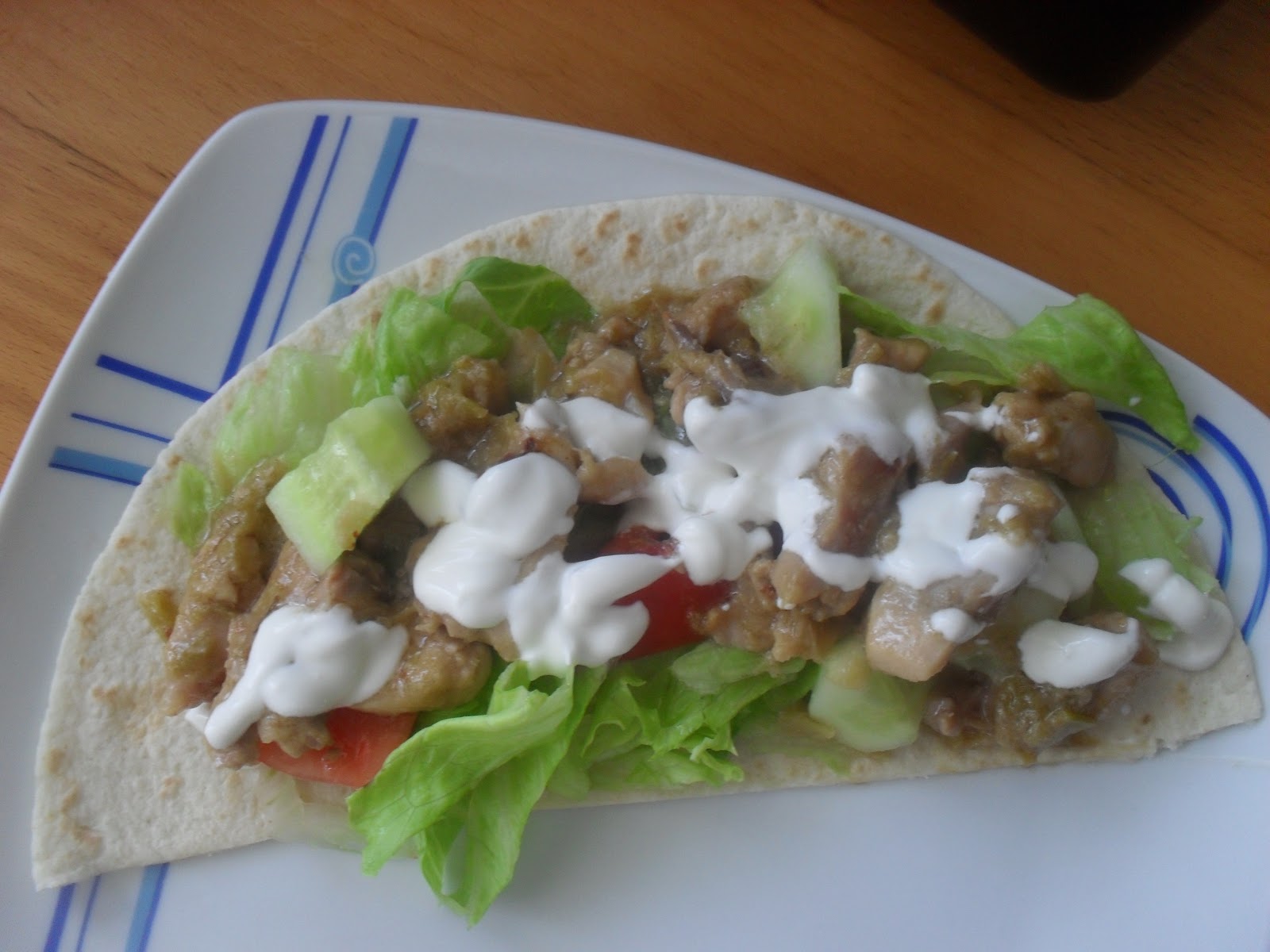 Kuřecí maso nakrájíme na kousky a smícháme se lžící oleje, hořčicí, nadrobno nakrájenou cibulí, sojovou omáčkou a solí. Na rozpáleném oleji restujeme 10 minut. Orestované maso podlijeme 1 dcl vody a dusíme 10 minut. Rajčata, okurku a ledový salát nakrájíme na malé kousky. Maso podáváme s nakrájenou zeleninou a zakysanou smetanou zabalené do ohřáté kukuřičné tortily.