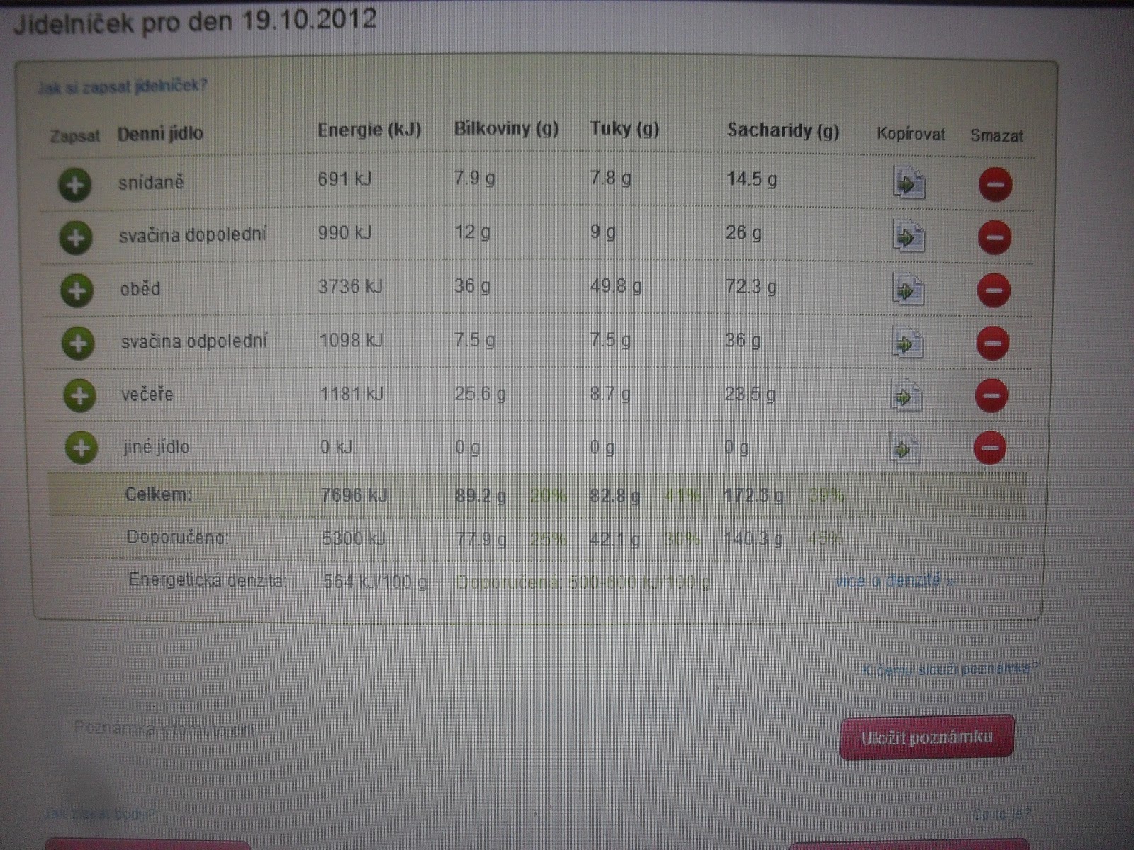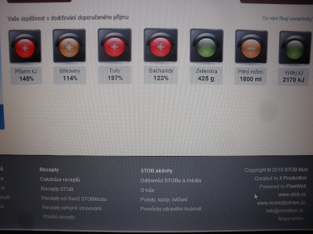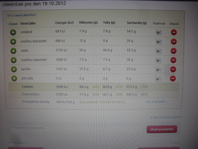 No a dnesni jidelnicek?Ten byl hruza a des :-(Po tom,co jsem si ho zadala do koucinku,tak bych si za to nejradsi nafackovala :-),pac kdyz jsem videla ty vysledky,tak se mi udelalo mdlo....proste jsem to dnes neodhadla a ekne mi to tam naskakalo :-(Mam se jeste , co ucit :)