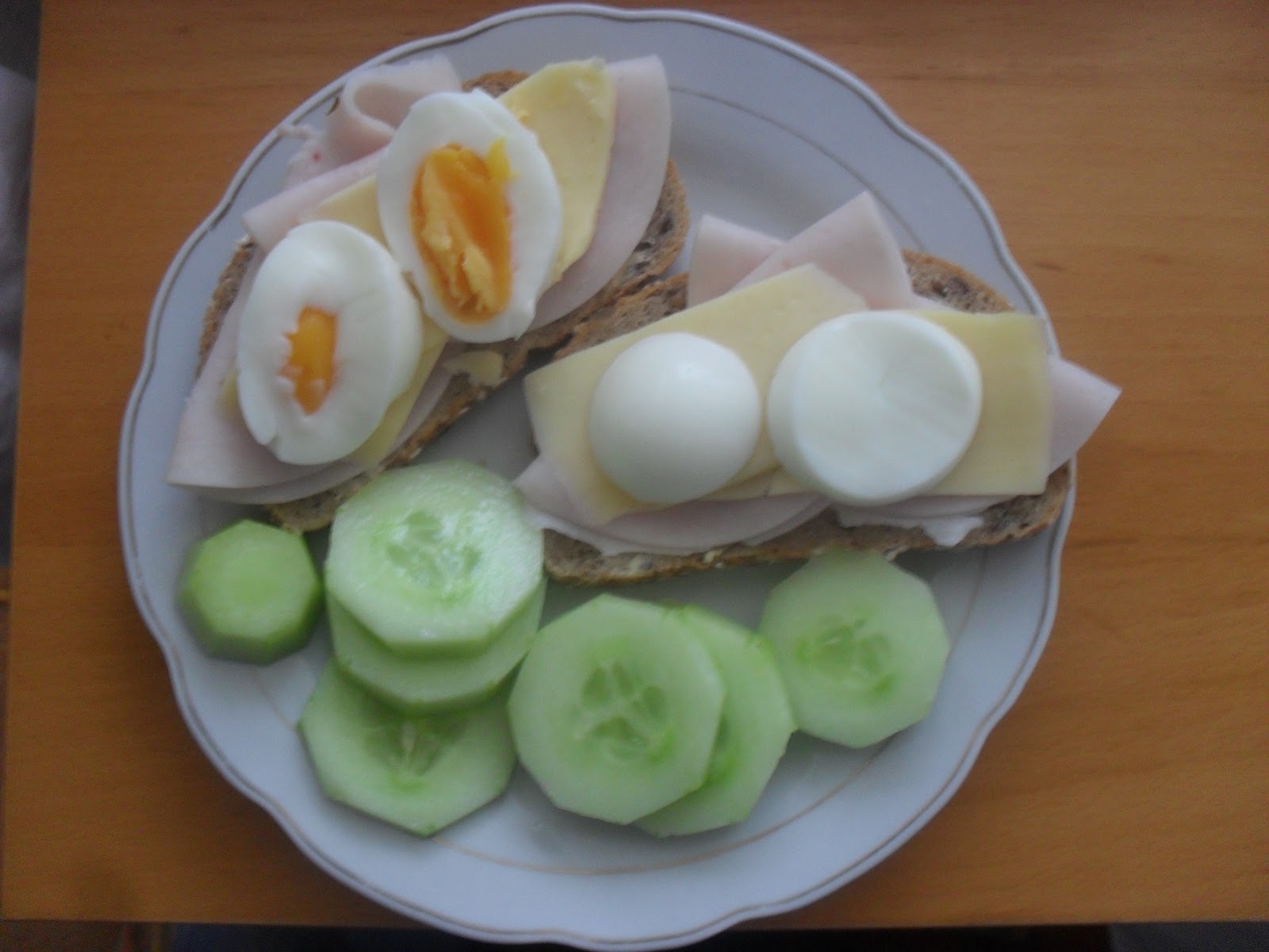 snidane- lamankovy chleb, sunka, maslo, tvrdy syr, vajicko,okurek