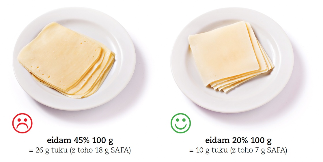 Když si místo 45% eidamu dáte 20%, ve 100 g ušetříte 16 g tuku. Pokud vám 20% sýry nechutnají, zařazujte 30%.