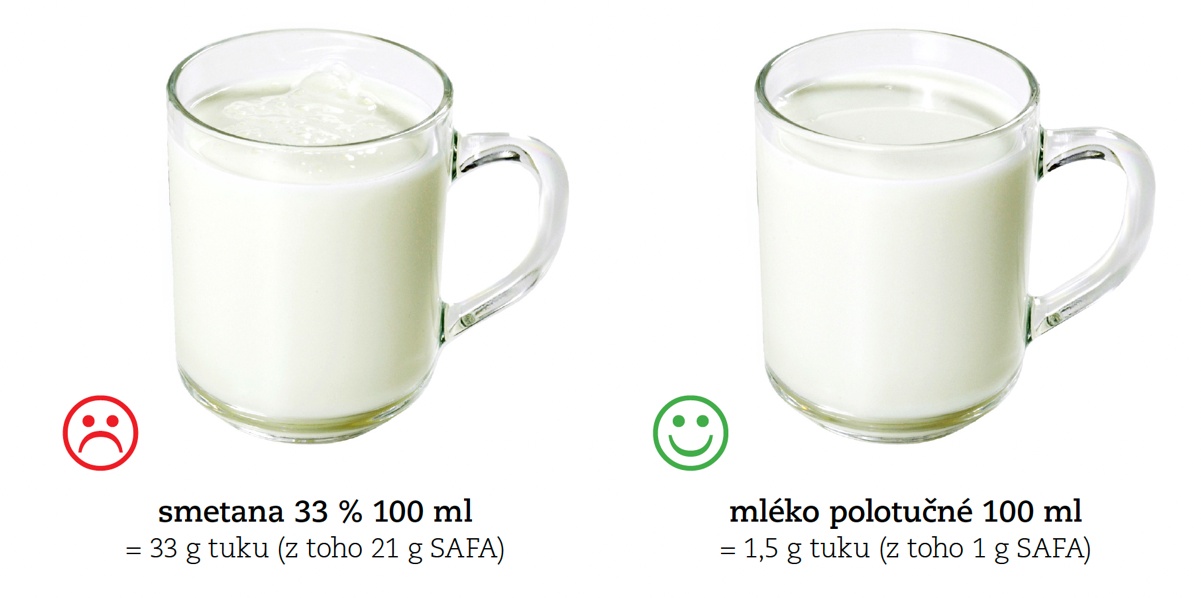Když místo 33% smetany použijete při vaření polotučné mléko, ve 100 g ušetříte 31 g tuku.