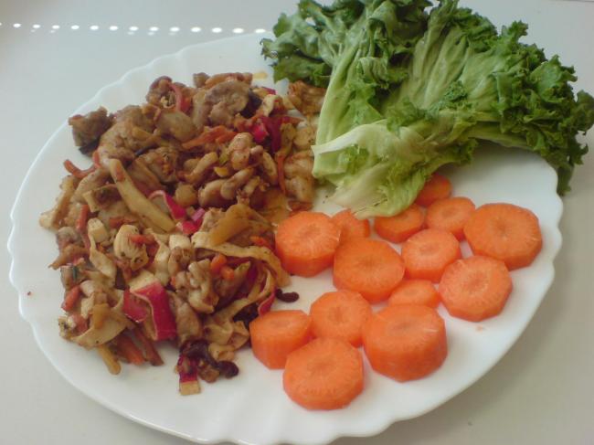 tááákže recept ?... množství si asi každá dáte své, tak jen řeknu ingredience. Kuřecí stehenní řízky, krabí tyčinky, čínská mražená zeleninka, grilovací koření ....všechno dohromady a okořeněné osmahneme na trošce oleje... a příloha ? jakou chcete :) ... jen asi místo stehenních řízků jsou lepší kuřecí prsa... o dost méně tučná..s tím sjem sice ujela, ale pro příště :) qué aproveche