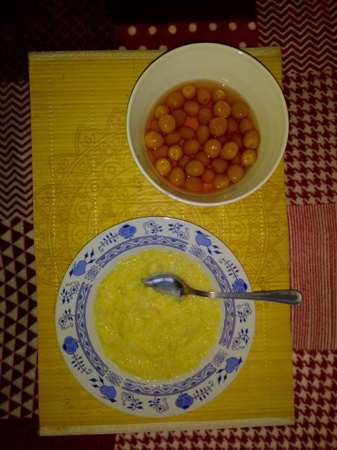 Dobrý den, tak jsem si uvařila k snídani den předem namočenou natural rýži a jáhly. K tomu jsem si rozdělala třešňový kompot. Super snídaně. Jáhly vařené na vodě, mám alergii na mléko. Přeji všem dobrý start do nového dne.
