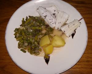 Zelený chřest povaříme v páře, pak nakrájíme na cca 1 cm špalíčky, na rámě cullinesse zpěníme cibulku a na ní dáme ještě produsit. osolíme a opepříme. Mezitím ne pánvičce se lžičkou másla podusíme osoleného a okmínovaného candáta. podáváme s bramborem.