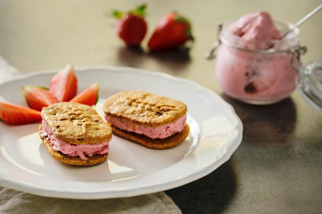 Mražené jahody rozmixujeme společně s ricottou a jahodovým džemem. Připravenou zmrzlinou plníme sušenky, můžeme ihned konzumovat nebo dáme do mrazáku, v případě druhé varianty necháme před konzumací trochu rozmrznout. Sušenky vybíráme celozrnné s co nejnižším obsahem cukru, případně si můžeme upéct i vlastní sušenky.