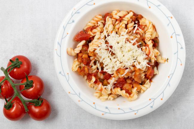 Omyté lilky a rajčata pokrájíme na kostičky a připravíme na páře doměkka. Máte-li parní hrnec, vařte rovnou i s těstovinami. Nakonec vše smícháme a zdobíme najemno nastrouhaným sýrem. Můžeme přidat i čerstvé bylinky a lehce zakápnout olejem.