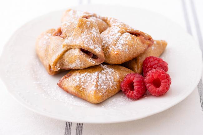 Jogurt smícháme s olejem a vejcem, přidáme špetku soli a čekankový sirup. Postupně zapracujeme mouku, aby nám vzniklo nelepivé těsto (v případě potřeby přidáme mouku nebo naopak jogurt na zředění). Těsto zabalíme do folie a necháme chvíli odpočinout. Těsto vyválíme na tenký plát a nakrájíme na čtverečky (cca 5x5 cm nebo větší). Na každý čtvereček dám lžičku tvarohu (tvaroh můžeme ochutit vanilkou, lepší je použít méně tekutý tvaroh, aby nevytekl), malou lžičku malinového džemu a na kousky nakrájené maliny. Rohy křížem ohneme a zabalíme do šátečků (okraje potřeme rozšlehaným žloutkem, aby se nám dobře slepily). Celé šátečky potřeme rozšlehaným žloutkem a pečeme při 170 stupních cca 15-20 minut. Pokud by nám šátečky připadaly málo sladké, můžeme před podáváním lehce pocukrovat. Do náplně lze místo tvarohu použít i cottage nebo například hustší vanilkový pudink. Hmotnost hotového pokrmu 620 g, celkem z ingrediencí připravíte cca 20 malých šátečků. EH na 100 g = 1080 kJ, 1 malý šáteček = 330 kJ.