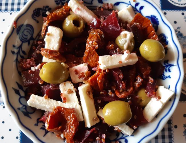 Nakrájím vařenou červenou řepu, přidám vařenou quinou (mám na mrazáku vakuované malé balíčky), nakrájená sušená rajčata, sýr feta a olivy včetně části nálevu a pokapu olejem z vlašských ořechů.