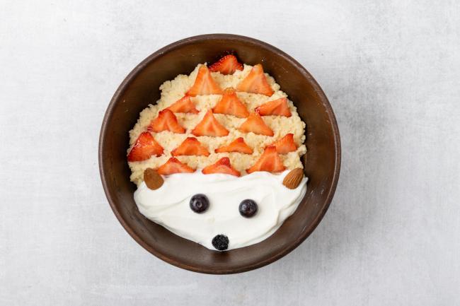 Jáhlové vločky nasypeme do hrnce a přilijeme mléko (nebo vodu, případně lze dát část mléka a část vody). Vaříme na mírném plameni, dokud kaše nezhoustne. Dle chuti můžeme na závěr osladit trochou rozmixovaného banánu, ale pokud dítě sladkou chuť nevyžaduje, tak to není potřeba. Kaši lze připravit i z jiných druhů vloček - tradičních ovesných nebo třeba pohankových. Dozdobíme jogurtem, jahody nakrájíme na plátky a vytvoříme bodlinky, oči a čumáček uděláme z borůvek (menším dětem překrojíme napůl) nebo rozinek. Uši uděláme z mandlí nebo pro menší děti z překrojeného hroznového vína.