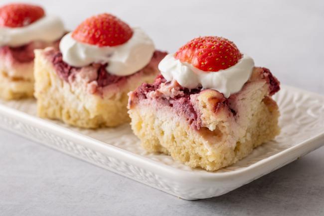 Množství ingrediencí odpovídá menšímu pekáčku. Mouku (můžeme použít směs klasické a celozrnné špaldové nebo například ječné mouky) smícháme s kypřícím práškem a 40 g cukru. V jiné míse si promícháme 2 vejce, olej a mléko. Obě směsi promícháme dohromady a vytvoříme lité těsto. V případě potřeby zahustíme moukou nebo naopak zředíme mlékem. Pekáček si vymažeme olejem a vysypeme moukou a vlijeme těsto. Tvaroh vyšleháme s jedním vejcem, 30 g cukru a vanilkovým pudinkovým práškem. Přidáme do pekáčku na připravené těsto a poklademe překrájenými jahodami. Pečeme při 170 stupních cca 40 minut. Před podáváním můžeme dozdobit tvarohem a čerstvými jahodami. Hmotnost hotové bublaniny: cca 1170 g, energetická hodnota na 100 g = 810 kJ. 1 porce odpovídá cca 70 g.