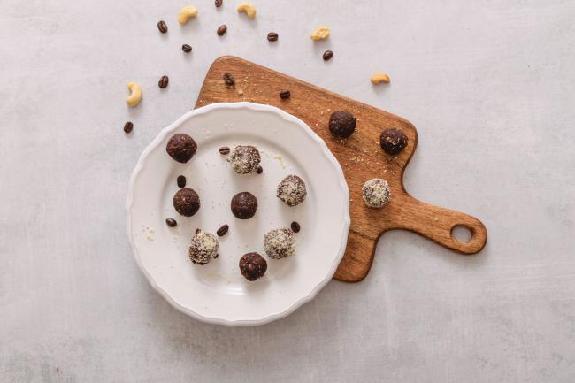 Kešu a vločky rozmixujeme. Datle také rozmixujeme. Přidáme velmi silné espresso, kakao a vše dohromady promícháme. Z těsta tvarujeme malé kuličky. Dle chuti je můžeme polít čokoládovou polevou a obalit v drcených oříšcích. 1 kulička bez polevy (= cca 12 g) = 160 kJ.