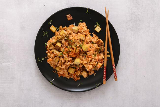 Rýži uvaříme. Tofu pokrájíme na kostky. Rozpálíme pánev, přidáme trochu řepkového oleje a opečeme tofu, dáme ho stranou z pánve. Na stejnou pánev přidáme uvařenou rýži a chvíli opékáme. Do rýže rozklepneme jedno vejce a na pánvi s rýži dobře promícháme. Stáhneme z plotýnky, do pánve přidáme opečené tofu, kimchi, promícháme a můžeme servírovat.