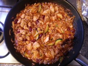 Nakrájíme si kuřecí prsa a hlívu na kostičky, cuketu na hranolky a vystříkáme pánev olejem ve spreji. Zahřejeme jí a dáme smažit nejprve maso a pak vše ostatní. Zelenina pouští vodu, ale můžeme i podlít, ale těsně předtím přidáme koření. Tak aby se zahřálo, ale nepřepálilo. Potom přidáme fazole z konzervy. Dusíme a přidáme trochu kečupu nebo rajského protlaku. Nakonec přidáme uvařené těstoviny. Necháme už jen dojít na horké pánvi.