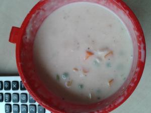 Do hrnce dáme kousek másla necháme rozpustit. Zasypeme hladkou moukou, mícháme a poté vsypeme mraženou zeleninu. Důkladně promícháme, zalijeme připraveným zeleninovým vývarem a přiklopíme pokličkou. Nakrájíme si na kostičky celer, petržel a na slabá kolečka pórek. Vložíme do hrnce a vaříme dalších 5 minut. Stáhneme na mírný plamen a postupně vmícháváme smetanu na vaření. Ochutíme kořením podle chuti, maggim, přidáme jíšku (nebo jemné ovesné vločky) a stáhneme hrnec z plotny. Podáváme ozdobené snítkou petrželky.