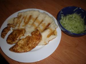 Dáme vařit brambory asi po 5 min. přidáme květák. Po uvaření scedíme, přidáme máslo, mléko a uděláme robotem pyré.K t.omu kuřecí prsa (koření na kuře, po dopečení dám do pánve asi 2 lžíce vody, po odpaření zbyde štáva z masa na polití kaše) a okurk. salát