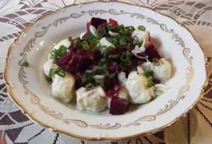 Brambory uvaříme den předem ve slupce. Červenou řepu uvaříme den předem ve slané vodě s bobkovým listem a svazkem tymiánu do poloměkka (cca 1 hodinu). Brambory oloupeme, nastrouháme na jemno, přidáme vejce, hrubou mouku, osolíme a vypracujeme těsto. Rozdělíme ma čtyři díly, z každého vyválíme váleček o průměru asi 2 cm a nakrájíme na asi 1,5 cm kolečka. Vzniklé noky poprášíme moukou, aby se nelepily a vaříme v osolené vodě asi 4 minuty. Scedíme. Část vody (asi deci) dáme stranou. Řepu oloupeme a nakrájíme na kostičky. Na jemno nakrájenou cibuli orestujeme na oleji, přidáme pokrájenou řepu, podlijeme červeným vinným octem, osolíme, opepříme a necháme ocet zredukovat. Do velké hluboké pánve dáme cca 4 lžíce vody z noků a přidáme rozdrobenou bryndzu, promícháme, přidáme uvařené noky a promícháme, až se noky spojí s bryndzou. Přidáme nakrájenou šunku a promícháme, podle potřeby můžeme přidat další vodu z noků. Do hlubokého talíře nejprve dáme noky s bryndzou a šunkou, doprostřed přidáme červenou řepu a nakonec dozdobíme na drobno nakrájenou jarní cibulkou nebo pažitkou.
