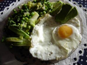 Mladý hrášok sparíme vo vriacej vode. Cibuľku a cukinu nakrájame, urestujeme, pridáme hrášok a na štvrtky nakrájaný šalát Little Genim (balené po 2ks, Tesco, Billa). Zľahka urestujeme, dochutíme bilinkami a podávame s volským okom, ale vynikajúci je aj s čerstvým kozím syrom. Dobrú chuť!