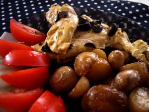 Kuracie prsia si naložíme do marinády a necháme postáť cca 3 hodiny. Čím dlhšie, tým sú prsia chutnejšie. Marináda : Jogurt - biele korenie - kari korenie- dijon horčica-soľ. Plech vymastíme kokosovým olejom poukladáme odležané prsia a pečieme pri 180°C cca 40 min.