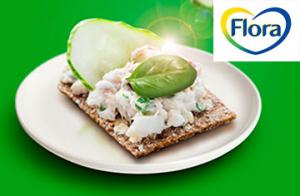 Prošlehejte tvaroh s margarínem Flora, solí a mletým kmínem. Přidejte nadrobno nakrájená cherry rajčata, okurku na kostičky a nadrobno nasekanou bazalku. Podávejte s knäckebrotem.