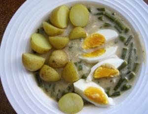 Fazolové lusky umyjeme, okrájíme konce a rozkrájíme na dvoucentimetrové kousky. Zalijeme 0,4 l vody s bujonem a vaříme 10-15 minut. Na pánvi si z oleje, cibule a mouky uděláme jíšku a rozmixujeme ji s trochou chladné vody. Kaši pak vlijeme do hrnce k fazolkám. Vaříme dalších 10-15 minut, dokud fazolky nebudou měkké, ale stále trochu křupavé. Na závěr dochutíme octem (používám rýžový), osladíme (cukr, agávový či jiný rostlinný syrup) a nakonec přidáme kysanou smetanu - asi tak jednu polévkovou lžíci. K fazolkám servíruji vařené brambory a vejce na tvrdo. Sama u sebe vystačím s půlkou vejce.