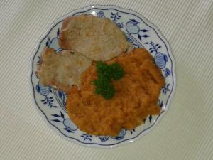 Zeleninu nakrouháme na plátky, dáme do pekáčku, okořeníme a nahoru položíme plátky vepřové libové pečeně. Podlijeme bílým vínem a dusíme v troubě do měkka. Vyjmeme maso a zeleninu do které přidáme lžičku Flory proactiv rozmixujeme.