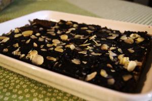Uvarenú cviklu rozmixujeme s karobom rozpusteným v 50ml kokosového oleja, medom a šálkou inastatnej kávy. Suché suroviny zmiešame a pridáme k nim cviklový základ. Vylejeme na vymastený a vysypaný plech a pečieme na 180°C asi 50min. PO upečení potrieme karobovou polevou - kokosový olej + karob + lyžica medu a posypeme plátkami mandlí.