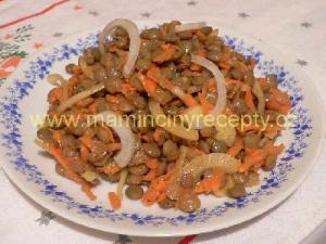 Přebranou čočku propláchneme a namočíme aspoň na hodinu. Pak společně se 2 kuličky nového koření a 1 bobkovým listem uvaříme doměkka. Scedíme, vybereme kuličky koření a bobkový list a necháme vychladnout. Mrkev nastrouháme, cibuli oloupeme a nakrájíme na tenká půlkolečka a přidáme k vychladlé čočce. Z 1/2 lžíce oleje, 1/2 lžíce hořčice, 1/5 lžíce octa a soli vidličkou v hrnku ušleháme zálivku. Nalijeme na čočku a všechno důkladně promícháme. Podle potřeby dochutíme solí a mletým pepřem. Necháme chvíli rozležet v chladu. Podáváme s pečivem.