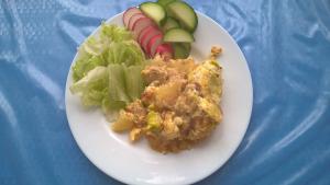 Uvaříme si brambory. Kuře nakrájíme na drobné kostky, okořeníme, zalijeme kapkou oleje a smažíme. Poté přidáme česnek, trochu pórku, jarní cibulky a opět orestujeme. Další přidáváme na kostičky nakrájená rajčata, papriku, promícháme a chvilinku dusíme. Můžeme zlehka podlít vodou, kterou ale postupně musíme vyredukovat. Dále si rozmícháme jedno vejce se sýrem cottage, solí, pepřem a trochou sušené bazalky v další mističce. Uvařené brambory rozkrájíme na kostky a vložíme do zapékací misky vyložené pečícím papírem (klidně i do menšího a obyčejného kastrůlku), zasypeme směsí zeleniny a masa a zalijeme rozmíchaným vajíčkem. Důkladně promícháme odspoda, uhladíme, posypeme zbytkem pórku a dáme zapékat do trouby na vyšší teplotu, než se vajíčko pořádně zatáhne a budeme si jisti, že je hotovo :)) . Podáváme se zelenivou oblohou.