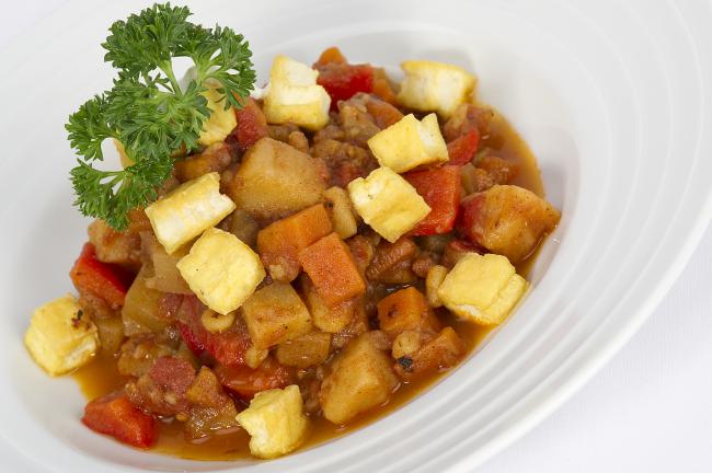 Cibuli nakrájíme na slabé plátky a orestujeme do světle hnědé barvy. Přidáme sladkou papriku, bobkový list, prolisovaný česnek a zalijeme zeleninovým vývarem (vodou). Do takto připraveného základu vložíme na kostky nakrájené brambory, mrkev, celer a rajčata a dusíme cca 30 min. Poté přidáme na kostky nakrájenou kedlubnu a papriku a vše dusíme ještě cca 10 min. Na závěr dochutíme solí, pepřem, sekanou petrželovou natí a těsně před podáváním zjemníme zakysanou smetanou. Tofu nakrájíme na kostky, osmažíme na troše oleje a přidáme do hotového guláše.